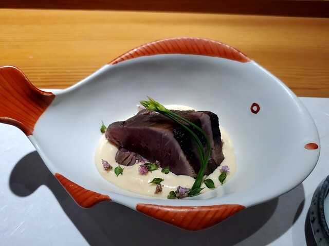 藁焼きの薫香を付けた鰹の炙りに合わせるのは酒盗とクリームチーズを使った白いソース、これはまさに白い麻薬。何度食べても悶絶級の美味しさでありカウンター全員がソースに夢中。ニラの蕾が添えられて更に悶絶度合いが上昇し、皿を舐めたい衝動を我慢しなきゃいけない品。