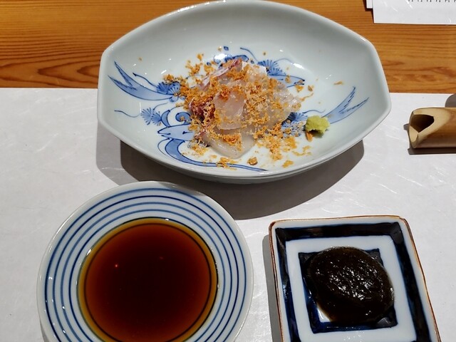 真鯛の鮟肝掛け、ポン酢、昆布醤油