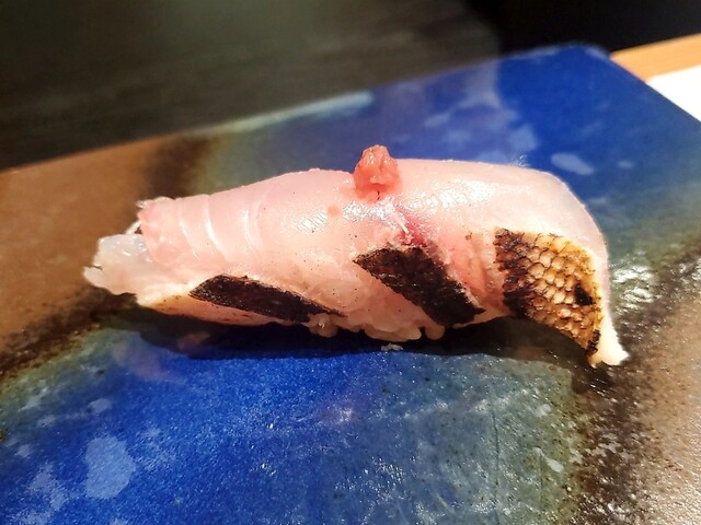 目の前で切る香り高い赤酢のシャリ、藁で燻すスマカツオ、軽く炙られたマグロ頬肉、錦江湾の並管髭海老、内臓脂肪たっぷりであったと思われるアカマツ、などなどラインナップにおいても見ていて聞いていて食べてみて楽しめる。