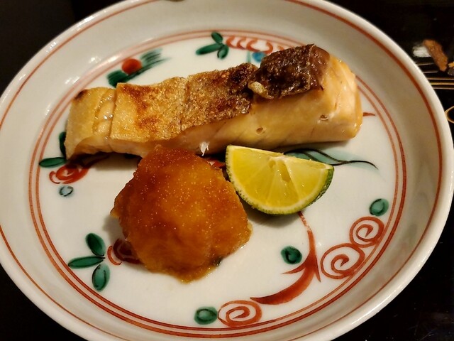 全体的に魚が美しく適度に脱水されています。まな板の上で貼り付く音、包丁を入れる際はスーッではなくショリショリという音が聞こえるほど。大根で挟んで金串を打って皮目を炙り、香ばしさとともに皮目の脂が活性化、筋肉質な生身の旨さ、溶け出す脂の旨さ、香ばしい皮目の旨さ。焼き物における食感のメリハリと香り。新多久さんの焼きは本当にずば抜けて素晴らしい。もう美味すぎ罪で逮捕しちゃうぞ。