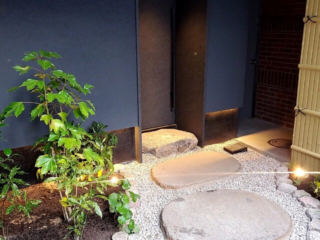 街中の喧騒から1本入って現れるお店には植栽と敷石。落ち着いた気持ちにリセットされて扉を開ければ美しく広いウェイティングスペース。まるで「魚のいない水族館」のような雰囲気のウェイティングスペースから店内へ。