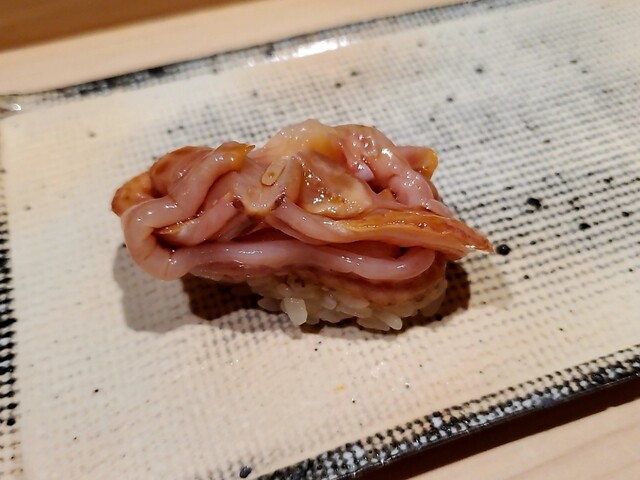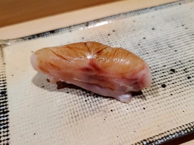 鮑の肝ソースがおそらく出るであろうとは想像しておりましたが、良くある肝ソースとは色も粘度も異なりまして白っぽくてやや泡立っているソースでした。これがあまりにも美味しくて食べては飲み食べては飲みと日本酒が止まらず。気付けばシャリを入れていただける事すら忘れており、まるで器を舐めたかのように綺麗に完食してしまいました。