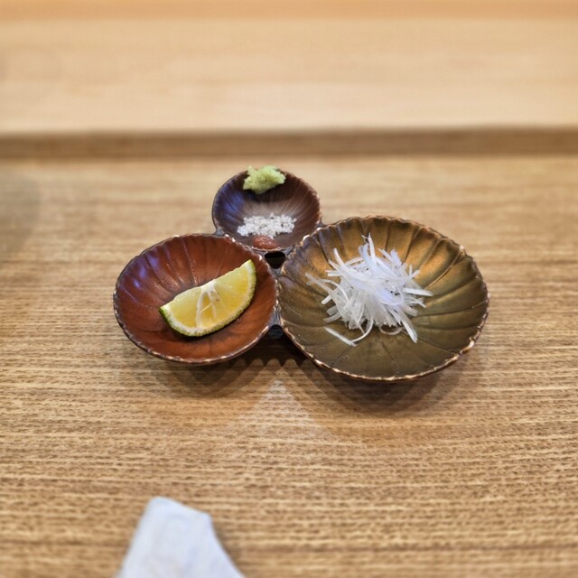 ②薬味(塩、梅鰹、わさび)を麺につけて食べる