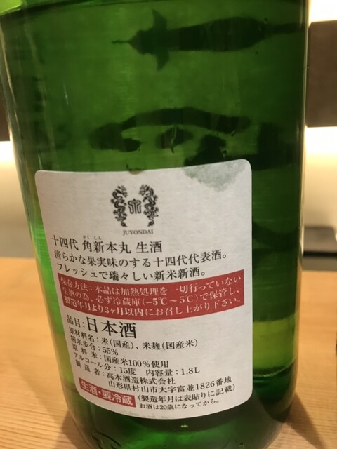 間のお酒に十四代の代表銘柄「角新本丸生酒秘伝玉返し」と「純米大吟醸酒未来大極上諸白」を。