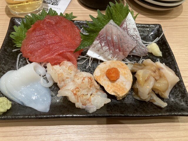 刺し盛、目光の唐揚げ、カキフライ、あんこうの煮凝り