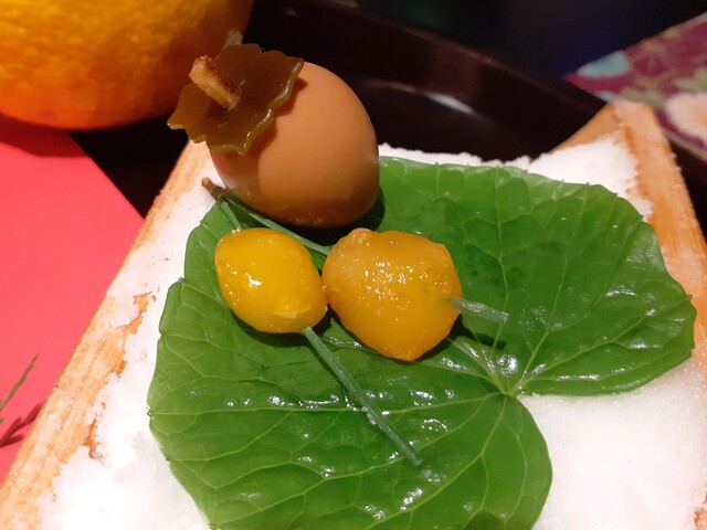 柿うずらはうずらの味玉に昆布で作ったヘタと茎で柿の実を再現!手が混んでます