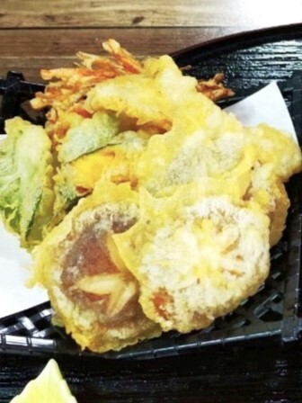 サツマイモ・かき揚げ・カボチャ・ピーマン・ナス・エリンギ・明日葉?