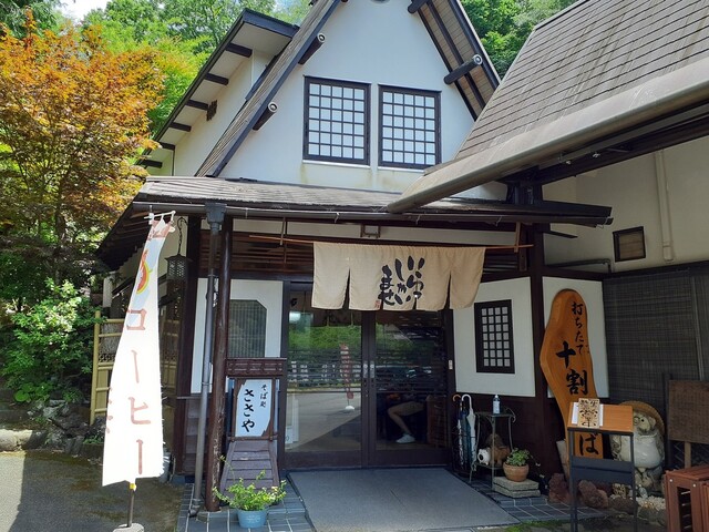 山道の途中突然現れる、ささやさんの看板左折、お店に繋がる道に駐車スペース