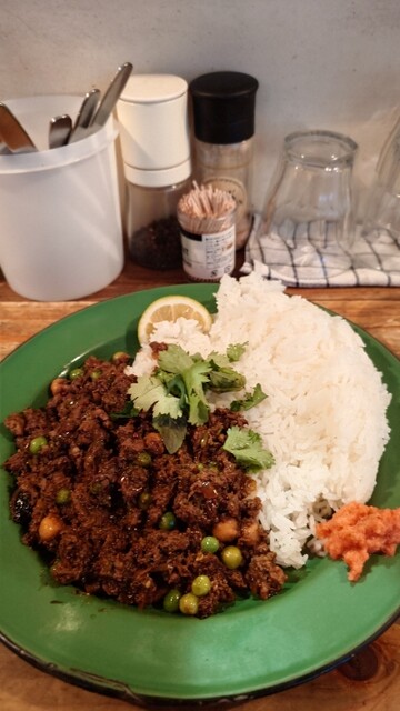 頼んだのは「スパイシーラムキーマカレー」。まずルーの香りがすごくて、スプーンを口に運ぶ前から香辛料の香りが鼻に抜ける。そして、一口目からスパイスの重みと辛さがしっかり広がって、「あ、これはカレー好きにはたまらないやつだ」と確信。ルーはジャスミンライスとよく馴染む。ご飯と合わせるとスパイスの香りと辛さがほどよく溶けあって旨い!