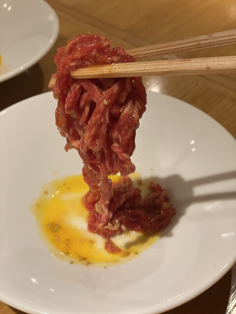 大好きなユッケ、生卵を絡めるとクリーミーになり美味しい