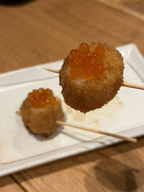 ホタテの串揚げにイクラがアクセント、初めての食感だった
