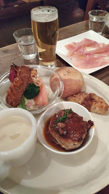 ワンプレートには小さなサラダボウルの様なガラスの器がひとつ、小さな白い器がひとつ、そしてスープカップが乗り、更に丸い自家製パンとコロッケ。