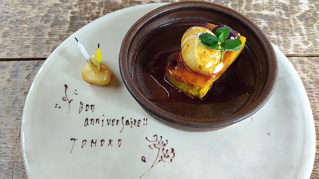 妻がチョイスしたそのかぼちゃプリンのデザートのお皿にはお祝いメッセージが書かれていて、小さなりんごのコンポートにロウソクが立てられていた。