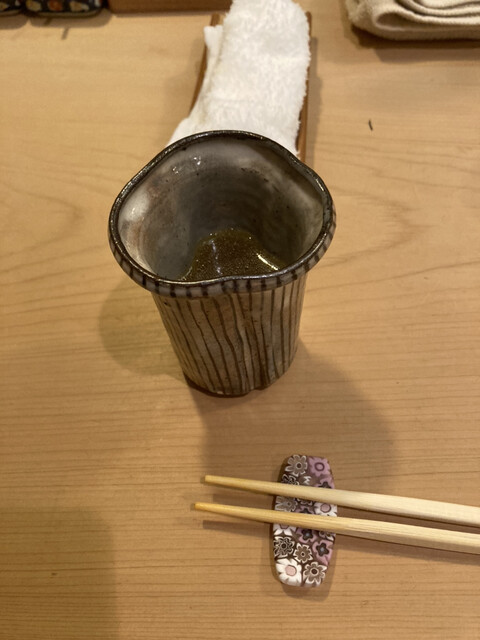 さて、お楽しみの別腹ということで、焼きおにぎりです。醤油が塗られて、海苔が挟まれて、香の物と味噌汁が添えられて出されました。これがまたうまい、極上の日本食という感じです。始めの頃は鶏釜飯とかを出していたらしいですが、お客さんの時間を使うので変えて出したおにぎりが好評だったので、これにしたとのことです。