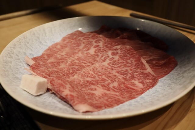メインのすき焼きは、手前が山形牛の霜降りサーロイン、奥が仙台牛の赤身肉。