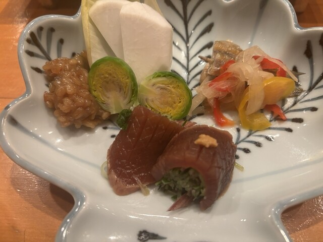 ⭐︎先付 公魚南蛮。ほろ苦さの中に近づく春を感じる。揚げて漬けての丁寧な仕事で骨まで美味しい。パプリカ、玉葱を厚めに合わせるのが大将の拘りでしょう。