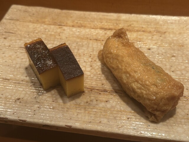 いなり寿司。細身で胡麻、大葉入り。玉子焼きは時間をかけてじっくり焼き上げたもの。更にキャラメリゼしたものの2種。焦げないギリギリのラインを攻めている和のデザート。大将の守備範囲の広さにも脱帽。