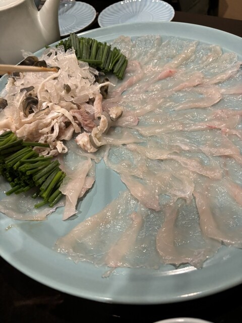 肉厚のふぐ刺し。ポン酢に薬味。そして肝。