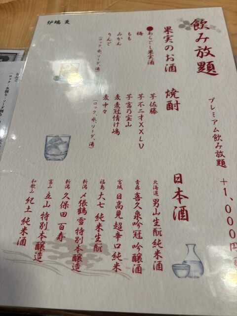 生ビール付き2h飲み放題¥1,500。さらにプレミアム+¥1,000で攻めます。