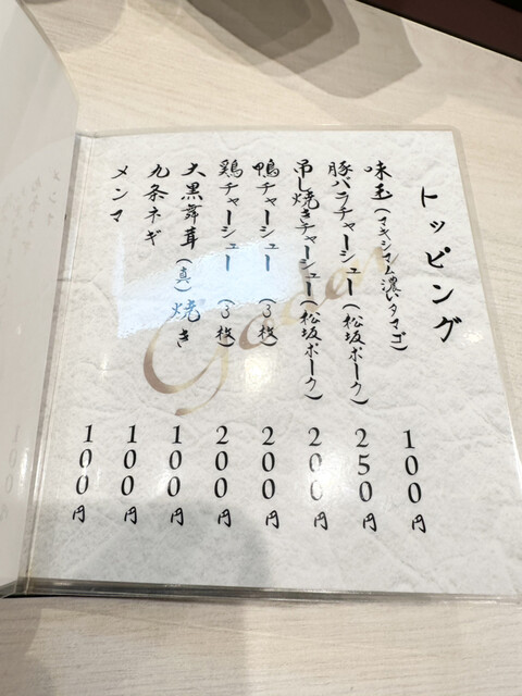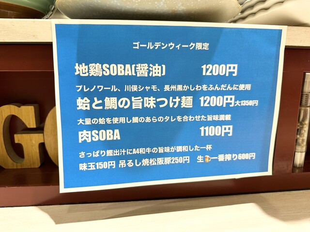 私の大好物、ざるチャーシューつけ麵を食べに来たのですが、ゴールデンウィークの今日は通常メニューはなく、GW限定メニュー3種類のみ、ご主人もおらず。