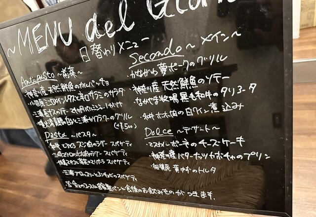 黒板に書かれた日替わりメニューからもお料理が選べて、2人の場合、前菜とパスタは2種類頼むと1皿に半分づつ2種盛りしてくださいます。取り分けなくていいのでありがたいです。また店員さんがその日特におすすめのお料理がどれかも教えてくれます。