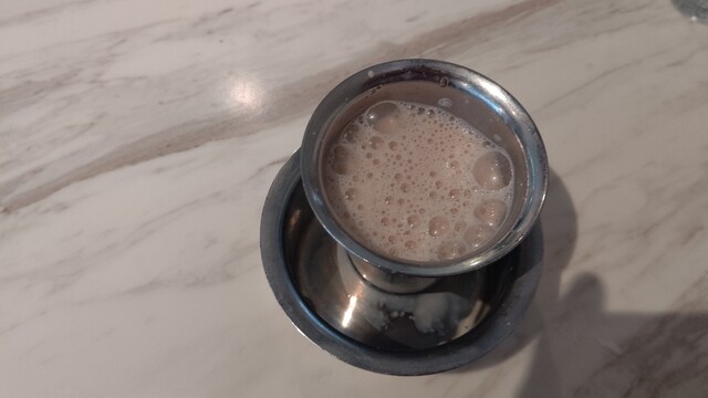 食後のチャイが到着。店員さんのパフォーマンス付き。チャイはまろやかで風味が楽しめます。