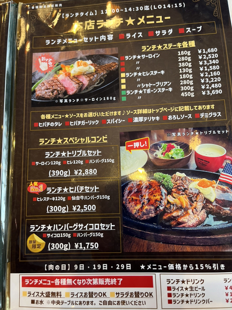 13時半過ぎに到着し、BLACKフライデーのお目当てのメニューは売り切れだった為、ランチヒバチセット(仙台牛150gとヒレステーキ150g)、