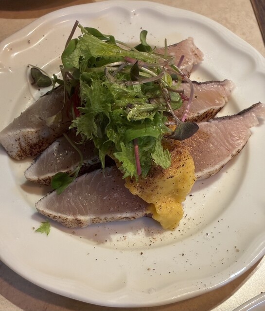 ● 炙り鰆と甘熟柿と花山椒のカルパッチョ