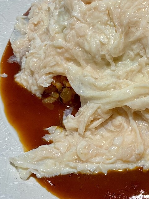 オムレツにナイフを入れると、ふわりとほどけてチキンライスを優しく包み込みます。