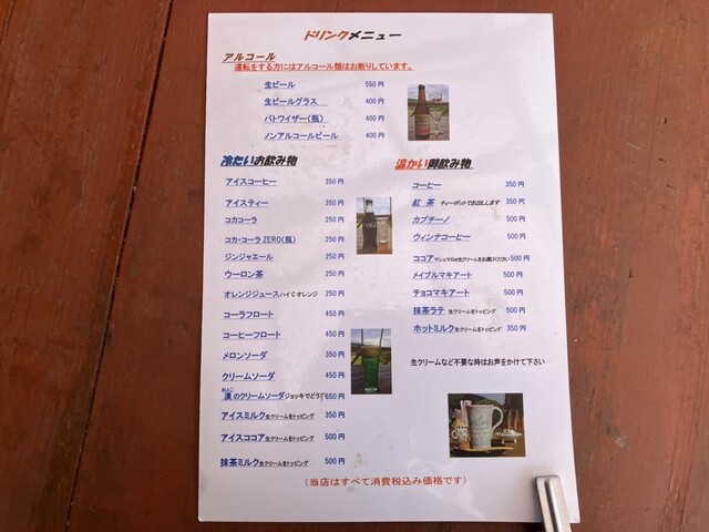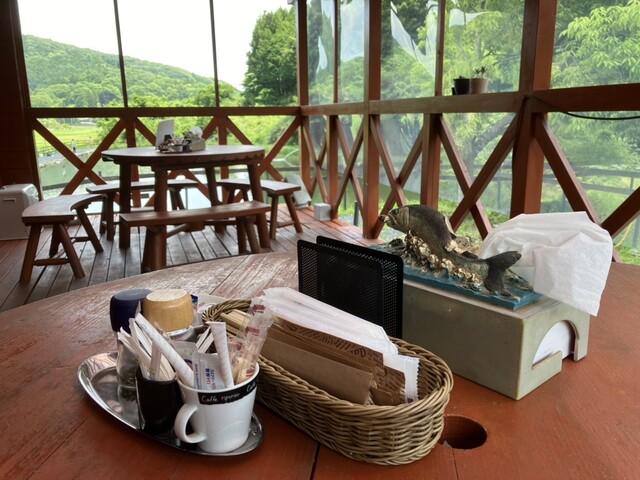 カフェのオープン時間が11:00だったので、その時間に入店したが既に店内は満席だった。店内に席な空きがなく、ウッドデッキ席に案内された。気候が最高に良い日だったので、ウッドデッキ席はパラダイスだった。ポンド(池)が目の前だから最高さ。カフェの店内席構成は、4人掛けテープル3脚、2人掛けテーブル1脚、カウンター4席。また、ウッドデッキ席は円形テーブル2脚で、1脚8人が座れる。