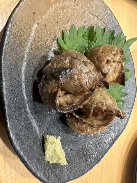 つまみは岩牡蠣、焼き蛤、穴子の肝を注文。岩牡蠣はプリプリでポン酢で食べるのは最高に美味しい。穴子の肝はなかなかお目にかかれない貴重なつまみで絶品。あればラッキー(ダメもとで毎回あるか聞いている。)。