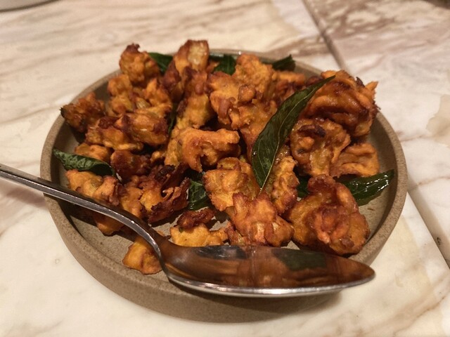爽やかスパイスの「インディアン・チョップド・サラダ」。辛味と苦味のパンチの効いた「国産レモンのアチャール」はバナナチップで。砕いた豆を衣に使用したインドの天ぷら「インドオニオンパコラ」。