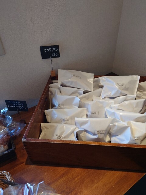 店内はこじんまりしていました。クロワッサンだけではなくパンも売ってました。自分用に2個とお土産に3個計5個買いました。価格はおおよそですが1個270円位から350円とか位かな…合計で¥1730でした。