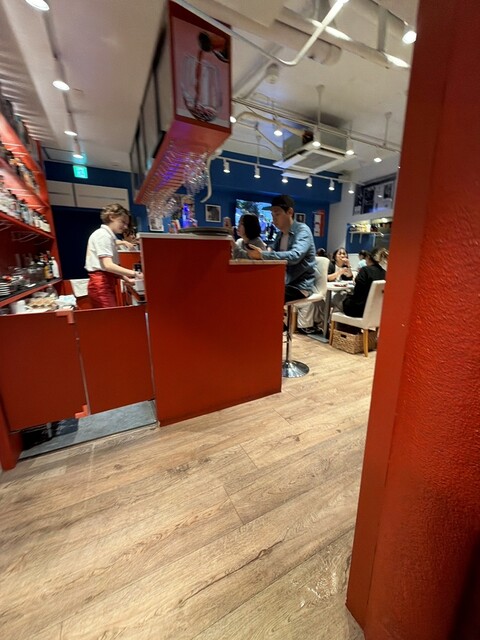 結構急で長めな階段を降りたら、トリコロールカラーの店内へ