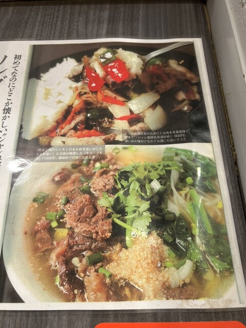 シヤンカウスエ スープ入りの麺と、食感良さそうな茶葉サラダをたのむ。1人でなければいろいろ食べたいし、味付けのくせがわかってればほんとはスープなし麺をたべたいところ、