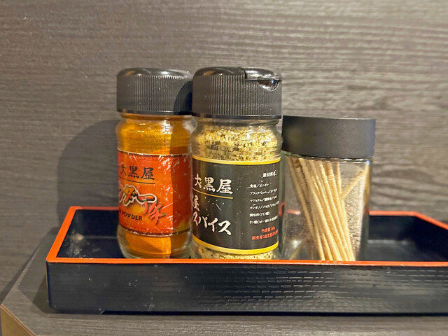 テーブルの横のトレイには「大黒屋スパイス」と「激辛パウダー」と楊枝が載っています。