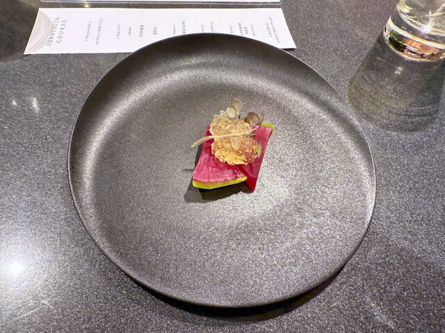 「紅芯大根の昆布締め 山椒香る酢橘ジュレ」。