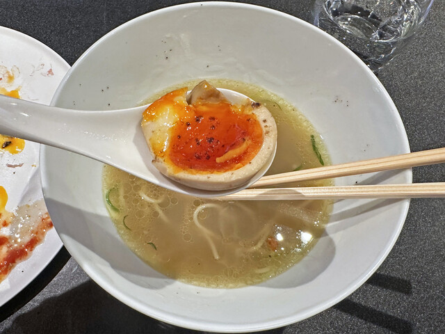 「トリュフ雲呑」は昨年大西店主の一周忌に行われた「Japanese Soba Noodles 蔦 × 中華蕎麦 とみ田 × らぁ麺屋 飯田商店 【友へ】 」の際にも有りましたが、あの時の雲呑は「らぁ麺屋 飯田商店」の餡をサマートリュフで包んだ超豪華版でした。