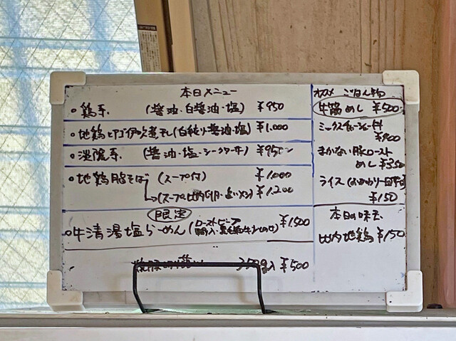 レギュラーは「鶏系(醤油・白醤油・塩)」¥950、「淡麗系(醤油・塩・シークワーサー塩)」¥950〜、「地鶏とアゴ伊吹煮干しのらーめん」¥1,000、「地鶏脂そば(スープ付き)」¥1,000、「地鶏脂そば(スープ・比内地鶏生卵・追い飯付き)」¥1,200と言うラインナップです。