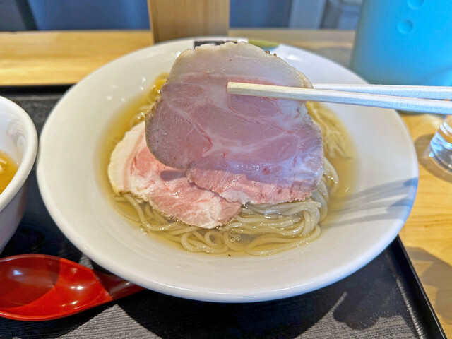 大きな鶏胸肉レアチャーシューや豚モモ肉チャーシュー、豚肩ロースチャーシューも美味しくて、穂先メンマの柔らかな食感も淡麗系スープに良く合っています。