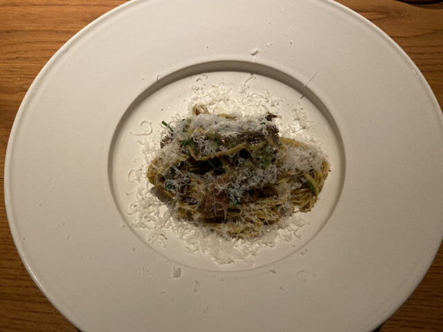 〆のパスタは、自家製でなんとも言えない食感でソースの絡み具合が抜群