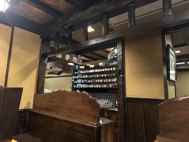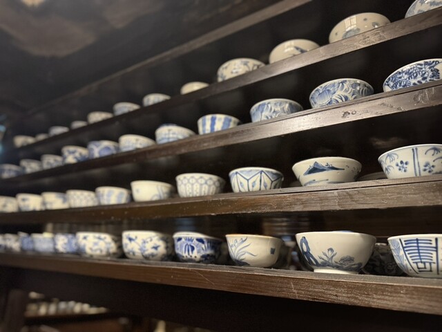 店内は、歴史を感じながら、骨董のお猪口や皿がところ狭しと並び、見ていて楽しい