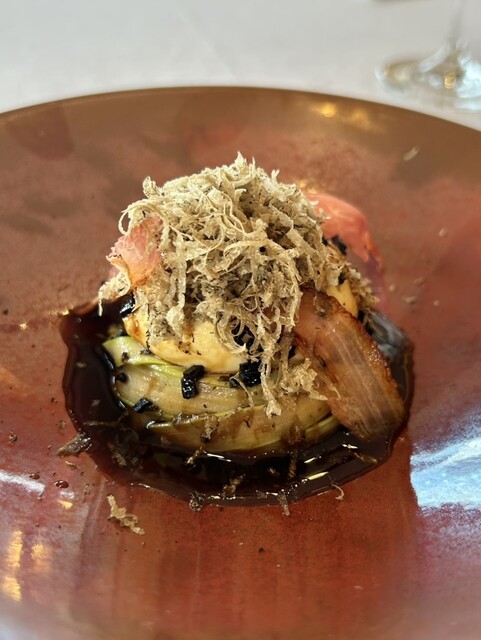 ヴィシソワーズの上に三輪そうめん、そこにカラスミが散らしてある。見るからに美味しそうで味が鮮明にイメージされたが、食べてみると思ったより塩味も旨味も控えめな味。しかしそれだけ繊細で上品なスタートだったと言える。とても美味しかったが、小さなスプーンで食べるように言われたのが解せない。そうめんをカタマリで掬い上げ一口でガブリと行かなくてはいけない。ちょっと難しく、同伴者はカラスミでむせこんでしまった。