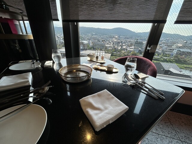 ダイニングルームも私が宿泊した部屋同様、素晴らしい眺望なのだが、何せ東山一望の東向き。朝の光が強すぎてスクリーンを下ろさざるを得ないのはチト残念。
