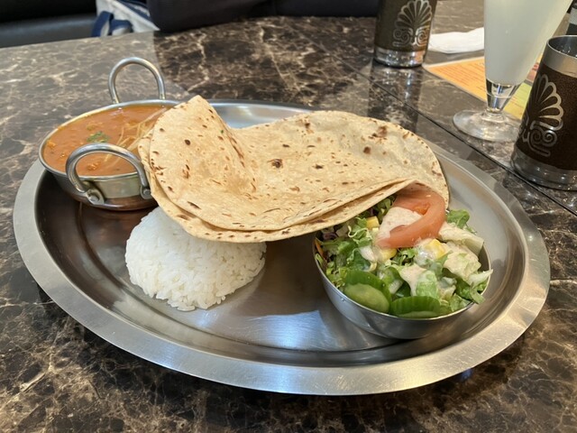 当方はガッツリhappyランチでマトンカレー&エビカレーの3辛、連れはチャパティセットでキーマカレーの3辛。