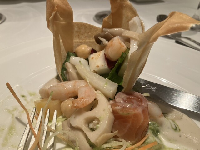 24品目のサラダはサーモン、海老、イカ等のシーフードとレンコン等の野菜が詰まっていて、味わいも見た目も楽しめます。(テレビのように綺麗に断面が出せないので、半分程食べた写真でスミマセン)