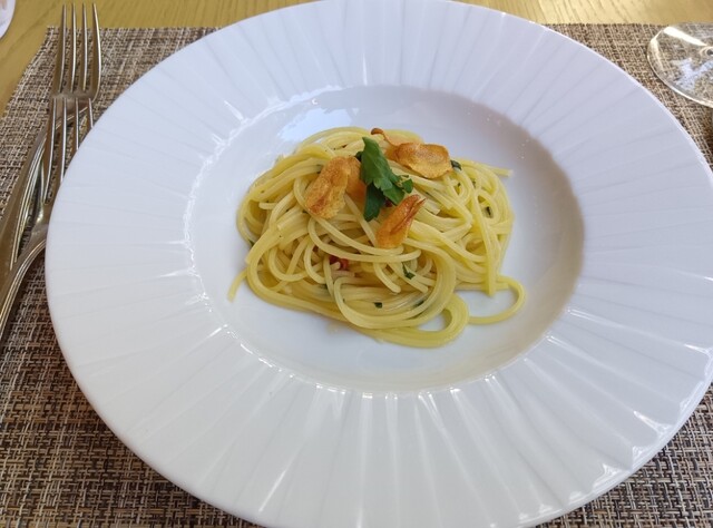 パスタはキノコとカラスミのペペロンチーノか蟹のタリオリーニのどちらかを選べます。(私はペペロンチーノを選択)