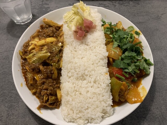 まずはパセリからですが、これでもかと言うくらいパセリが使われています。これまで食べたことの無い味わい。パセリを使ったカレー初めてですが、パセリの存在感とスパイスのコラボが最高。大根ポークこれもまた良いドライ具合。大根にスパイス、ポークがよく染み込んでいますが食感はしっかりシャキシャキ。どれ食べても美味い。