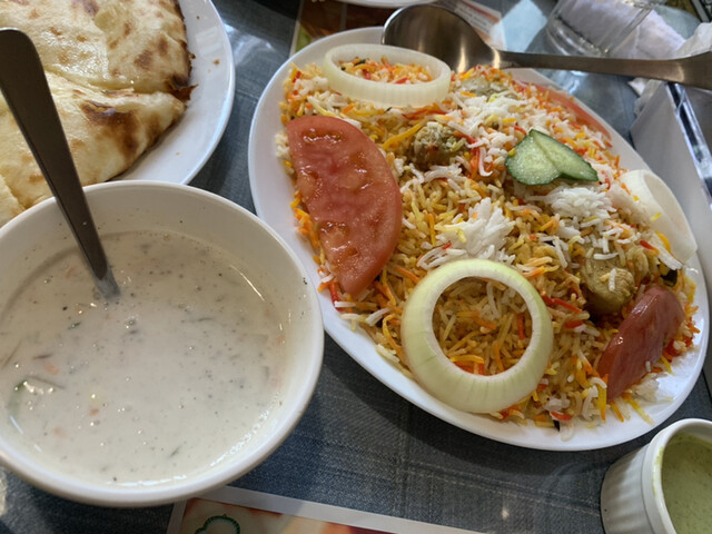 今日はお弁当や奥の広間にもお客さんがいて大繁盛。しばらく待つ事となりましたが、ビリヤニが提供されると、いつもながらそのボリュームに圧倒されます。ライタもたっぷり。