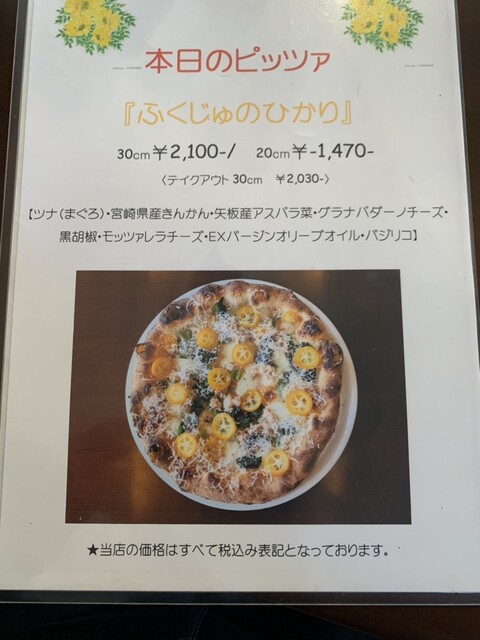 ますば注文しようと決めていたマルゲリータ、ビアンカギオットーネ、サルモーネ、そして当日目に飛び込んだ「ふくじゅのひかり」、生野菜のサラダを注文しました!